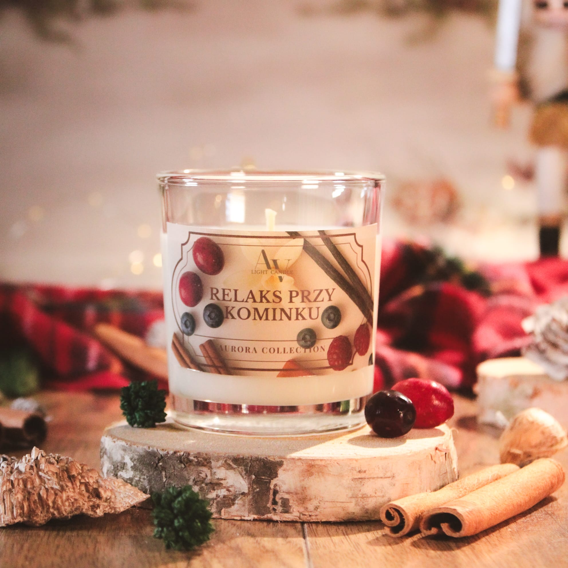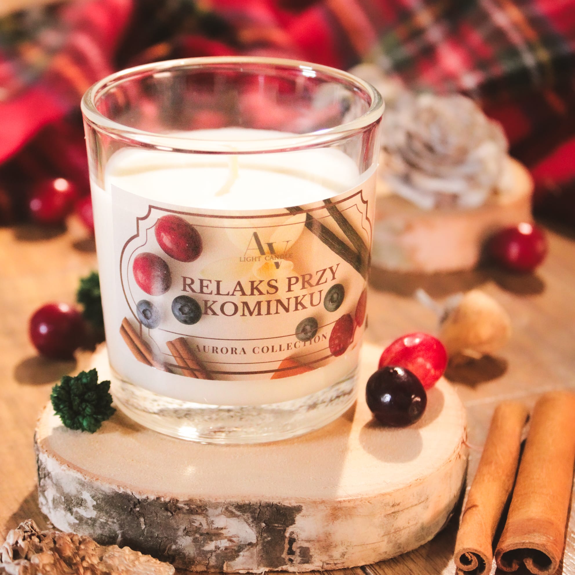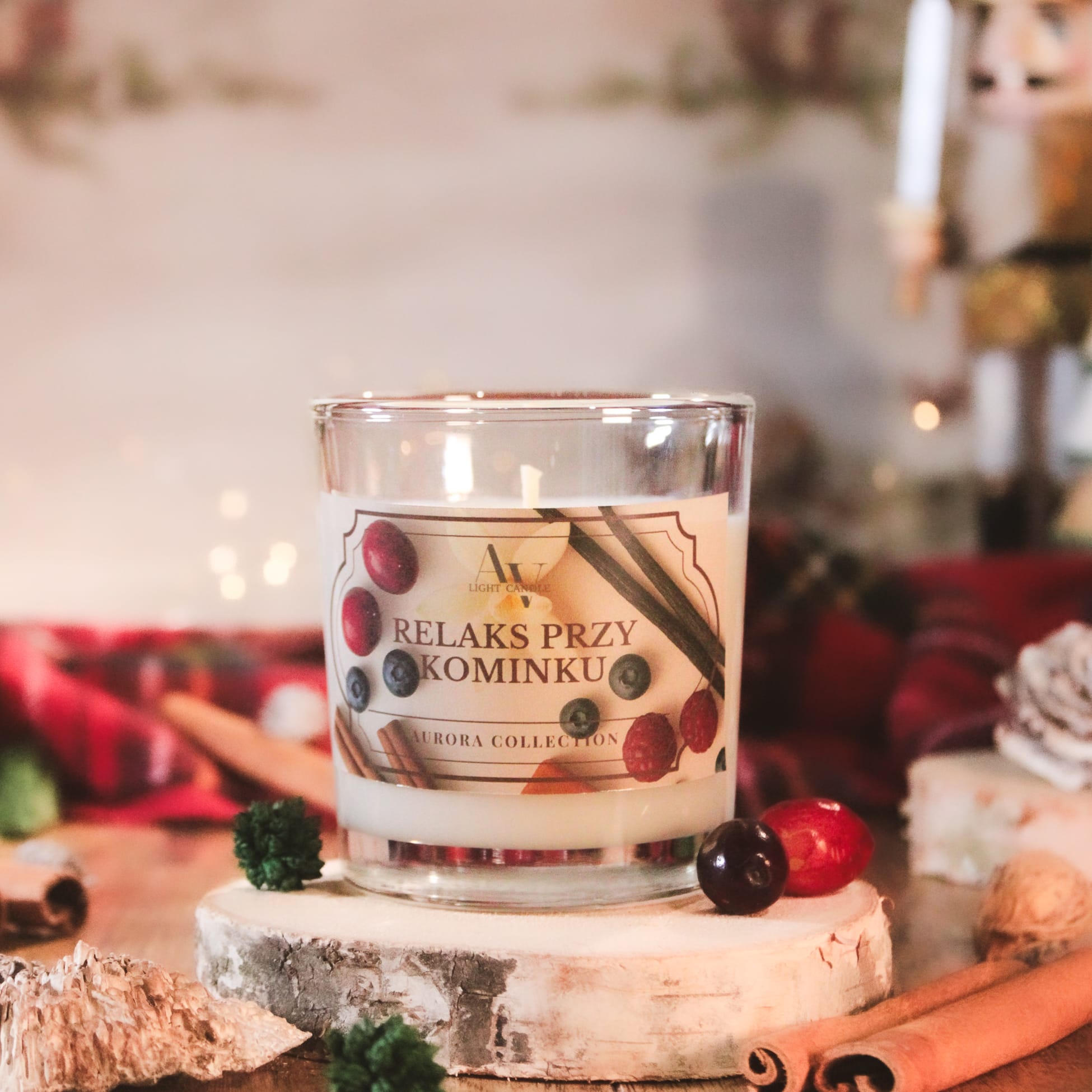 Świeca sojowa Relaks przy Kominku przenosi w atmosferę ciepła, spokoju i zimowego ukojenia. To zapach, który otula zmysły aromatem cynamonu, czerwonych owoców i nutą nostalgii — jak wieczór spędzony przy trzaskającym kominku. Kompozycja zapachowa tej świecy to intensywny cynamon połączony z soczystymi czerwonymi owocami. W sercu zapachu pojawia się jaśmin, paczula, róża i tuberoza – głębokie i zmysłowe nuty, które wprowadzają równowagę między ciepłem a elegancją. Bazę tworzą wanilia, dziegieć brzozowy, piżmo i delikatny karmel, nadając kompozycji trwałość i otulający charakter. To świeca sojowa, która nie tylko wypełnia wnętrze zapachem, ale także buduje nastrój. Idealna na wieczory, gdy potrzebujesz odpoczynku i ukojenia. Ręcznie wykonana w Polsce z naturalnych składników.